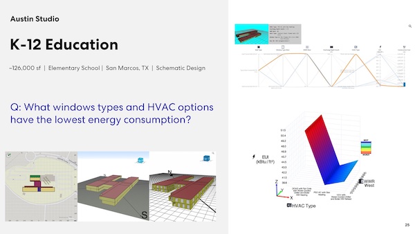 Most of use have seen the MacLeamy Curve before. It basically states that decisions made during the earliest stages of design are the most impactful and come at the lowest cost. However, the current state of most firms is to have simulation applied to these early stages at only a few points in the design process (at best). That does not provide effective design guidance.  The ideal state is to run energy, daylighting, and other performance simulations quickly and often to understand the tradeoffs and dependencies. Only with this strategy can simulation provide true design guidance.